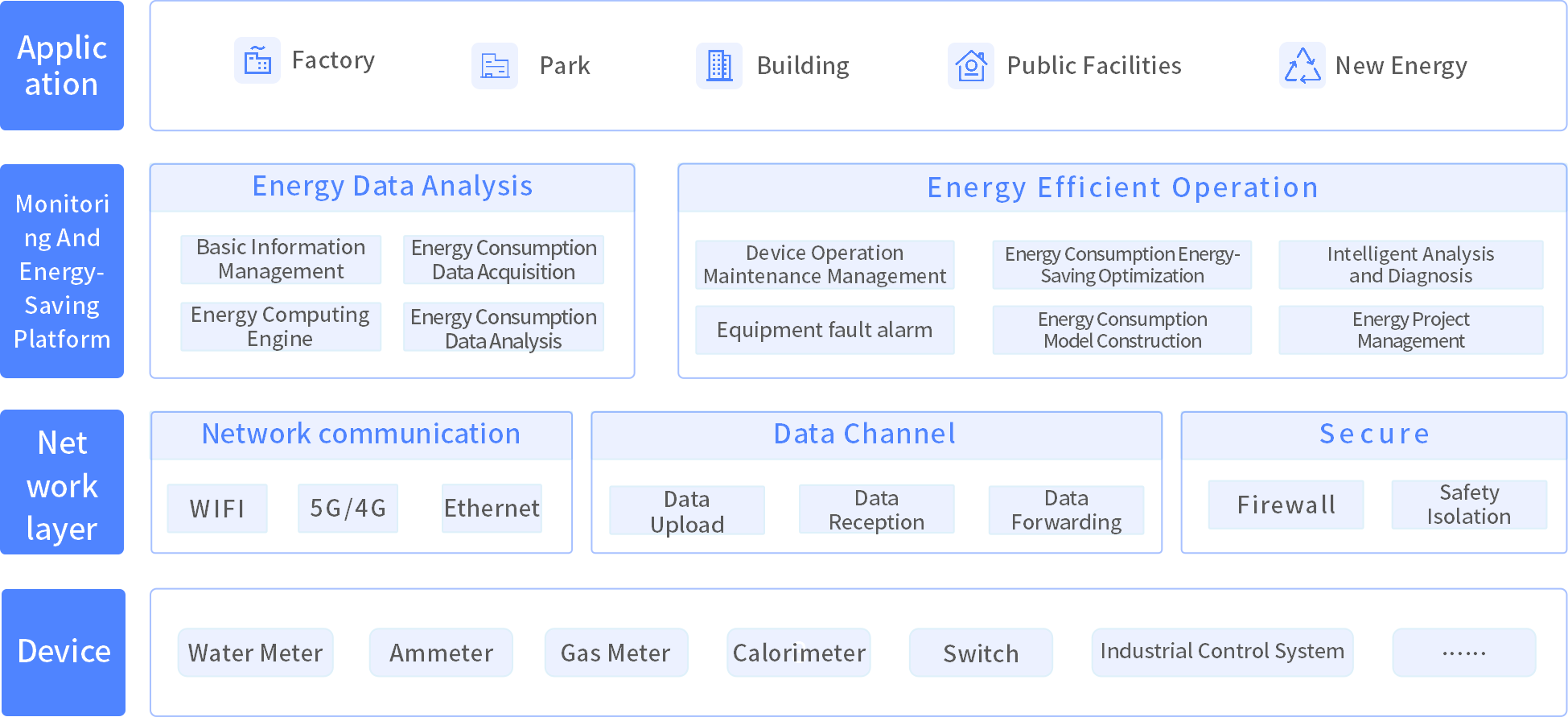 The energy consumption monitoring and energy-saving platform is based on the decentralized nature of the energy system and the centralized requirements of energy management. It collects and analyzes various energy data such as water, electricity, heat, and gas, and integrates functions such as equipment supervision, energy consumption monitoring, energy efficiency analysis, and energy control. It achieves refined energy management for enterprises, empowers them to save energy and carbon, and helps customers reduce costs and increase efficiency. Support multiple energy consumption scenarios such as factories, parks, residential areas, electricity, buildings, public facilities, etc.