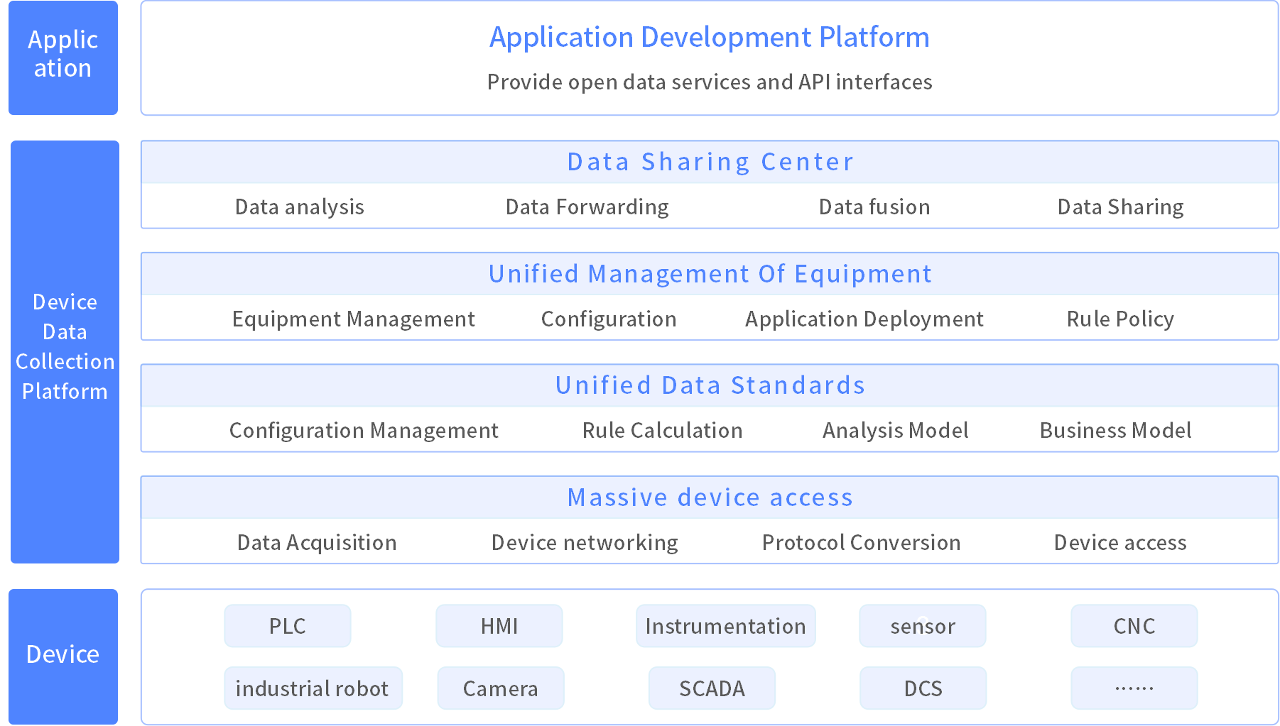 The SZN device data collection platform is connected to various industrial equipment (PLC, instruments, sensors, CNC machine tools, robots, etc.) to achieve data collection and bidirectional control of various industrial data on site; At the same time, the data will be stored on the platform after standardized processing to provide open data services and interfaces for various Industrial internet of things platforms, industrial Internet platforms and industrial software.