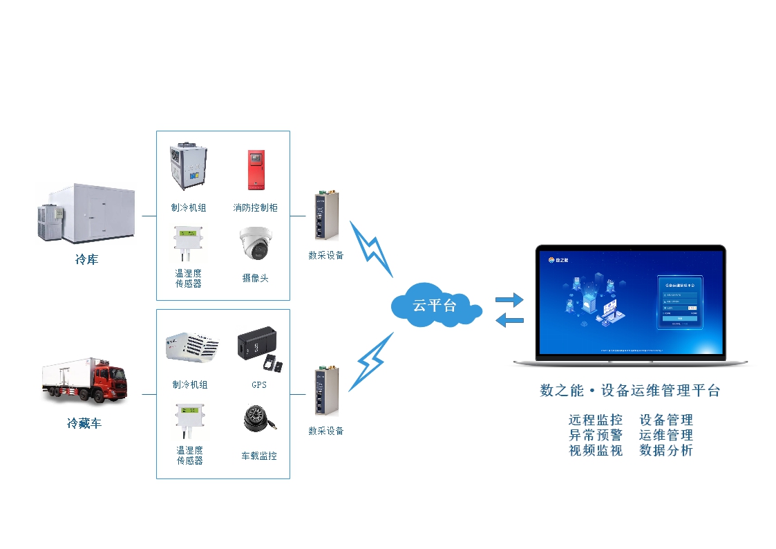 數之能推出的冷鏈物流全過程監控管理系統,通過采集制冷設備、消防控制柜、溫濕度傳感器、車載GPS、攝像頭等設備,并將數據實時對接到設備運維管理平臺中,實現了對冷鏈物流全過程的實時監控和管理。