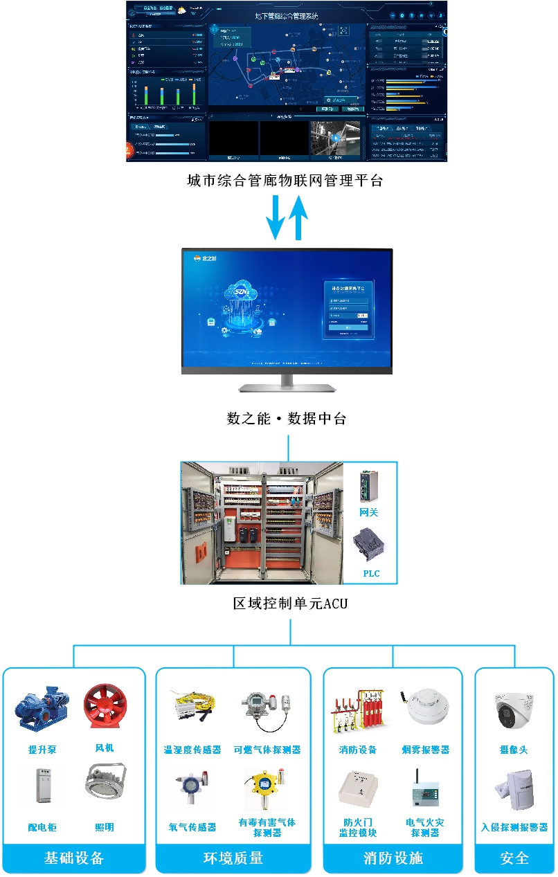 數之能推出的數據中臺能夠接入ACU區域控制單元,采集管廊內各種傳感器和其他設備的狀態參數,對數據進行標準化處理,從而實現遠程監控平臺對管廊環境、通風設備、排水設備和照明設備的不間斷監測、自動告警、遠程控制等功能,從而及時處理各個告警事件,保障管廊內的環境安全適宜以及通風排水等設備的正常運轉。