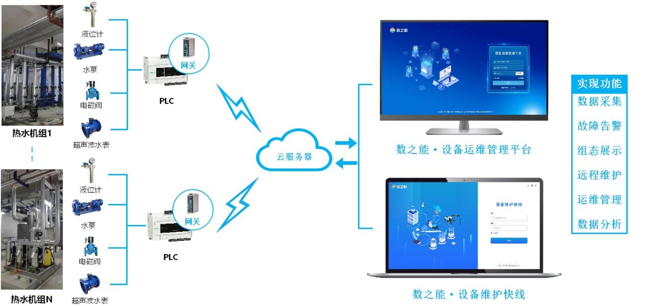 熱水機組數(shù)量多、分布廣,依賴現(xiàn)場人員巡查故障再報修,而企業(yè)缺乏集中監(jiān)控管理的手段,導(dǎo)致出現(xiàn)故障無從得知、維護不及時等問題,影響到居民用水安全與穩(wěn)定。