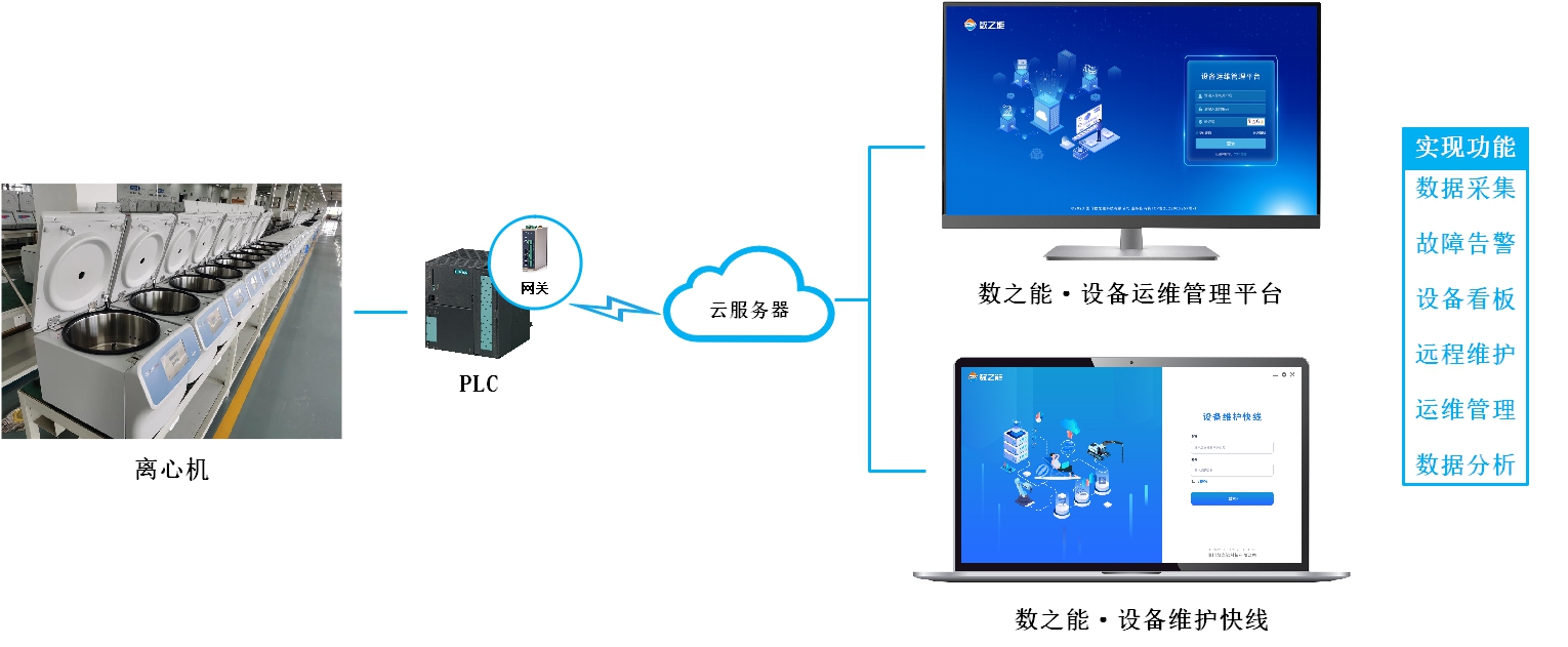 通過部署邊緣計算網關,將自動離心機的 PLC、傳感器等設備接入網絡,采集轉速、溫度、振動、運行時長等數據并對接到數之能設備運維管理平臺,支持多用戶、多設備、多廠區統一管理。運維人員和企業可通過電腦、手機等終端,隨時隨地訪問平臺,實現對離心機的遠程監控、故障診斷、運維調度與數據分析,構建起智能化、數字化的運維管理體系。