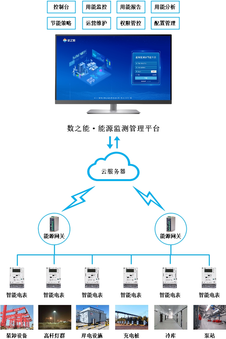 數之能工業網關接入裝卸機械、高桿燈群、岸電設施、充電樁、冷庫、泵站等站點的智能電表,將數據通過5G/4G/WIFI/以太網等方式對接到數之能能源監測管理平臺中,能夠實現對各類高能耗設備的數據采集與能源管理,并提供豐富的可視化界面和報表界面,將能耗數據以直觀、易懂的方式呈現給管理人員,為其提供決策支持,從而提高工作效率與節能水平,打造綠色節能智慧港口。